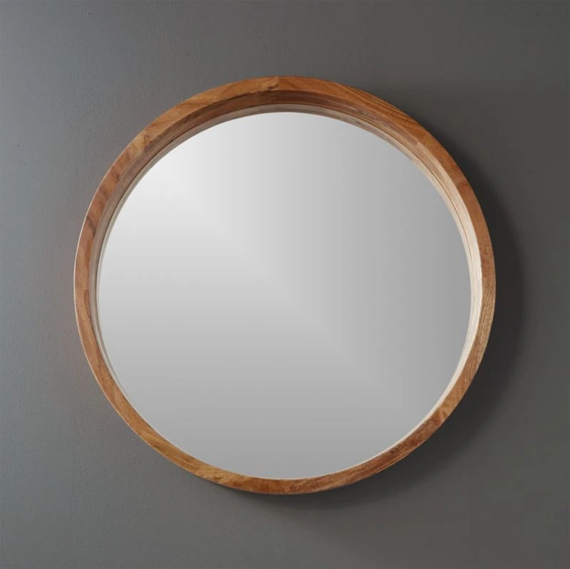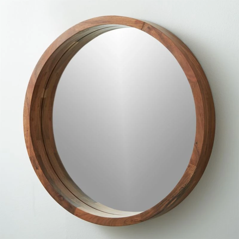 Solid sustainable acacia wood comes full circle to showcase a sweeping grain and warm hi/lo tones. Spanning two feet in diameter, handcrafted wooden frame rings the inset mirror with 3D depth. Mounting hardware is included.