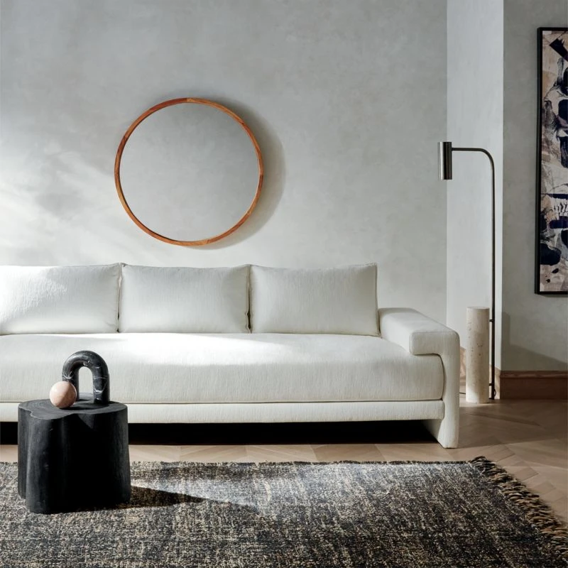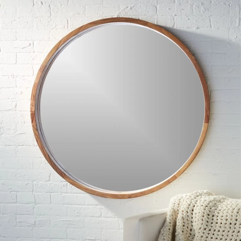 Solid sustainable acacia wood comes full circle to showcase a sweeping grain and warm hi/lo tones. Spanning over three feet in diameter, handcrafted wooden frame rings the inset mirror with 3D depth. Mounting hardware is not included.