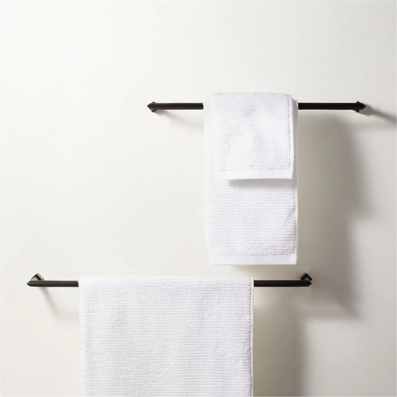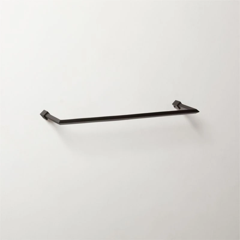 Designed by Barcelona-based Mermelada Estudio, unique beveled towel bar brings sharp lines and a touch of modern luxury to the bath. Solid brass construction is substantial; its quality is obvious. Bathroom collection also includes wall mount hook, towel ring and toilet paper holder. Learn more about Mermelada Estudio on our blog. CB2 exclusive.