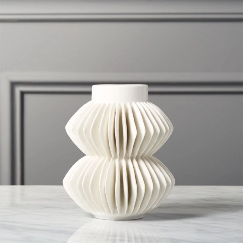 Modern Italian curves take 3-D turn in porcelain vase. Each rib is applied by hand to cylindrical base. Watertight for blooms.