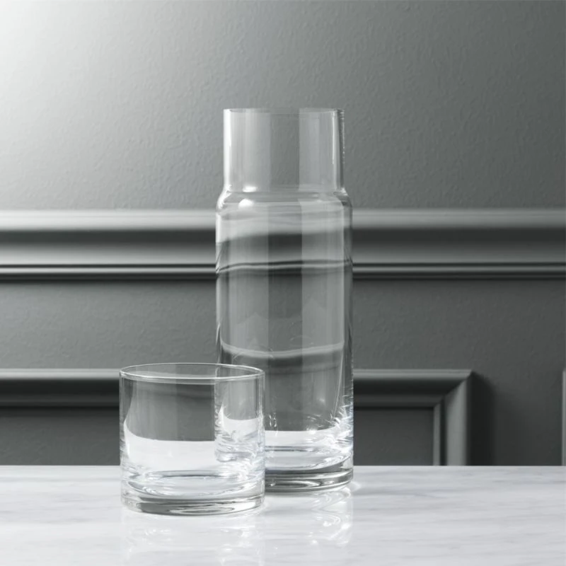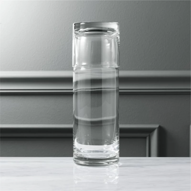 Two-piece handblown glass cylinder stacks its own cup. Makes a cool wine carafe, too.
