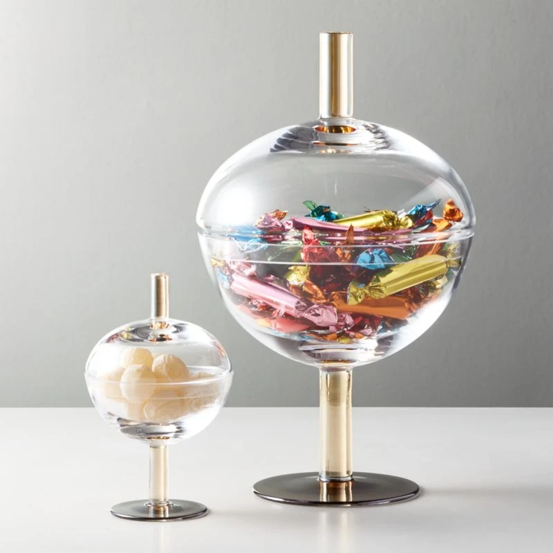Handblown smoke-colored glass forms a dish bowl and matching lid floating between sleek amber glass rods.