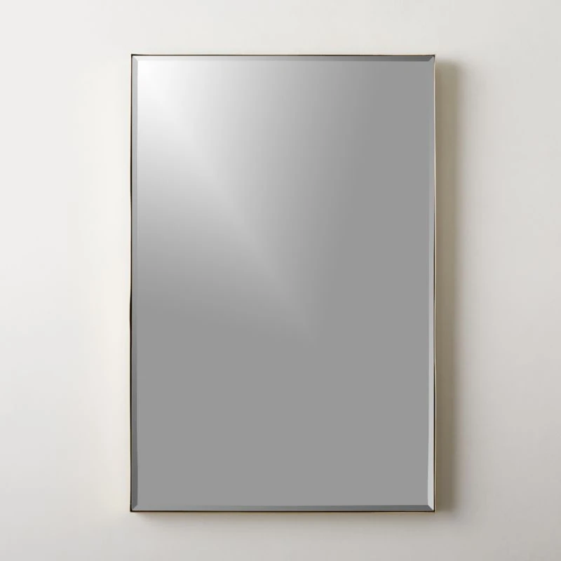 Beveled edges and brass line up in a handcrafted rectangular mirror that boasts both simplicity and depth. Solid polished brass creates an elevated look that hangs stunning above a vanity or as a goes-anywhere decor piece. Part of the Graduate mirror collection. CB2 exclusive.