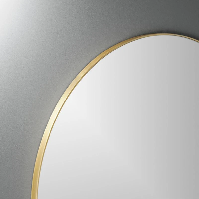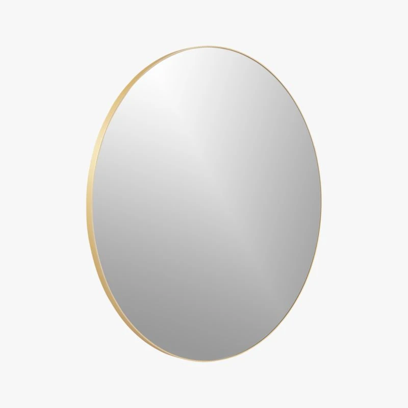 Mirror image without bounds framed thin, trim and exact in pure extruded aluminum with a brushed brass plated finish. Handmade frame resists corrosion so it’s perfect in the bath. Mounting hardware is included.