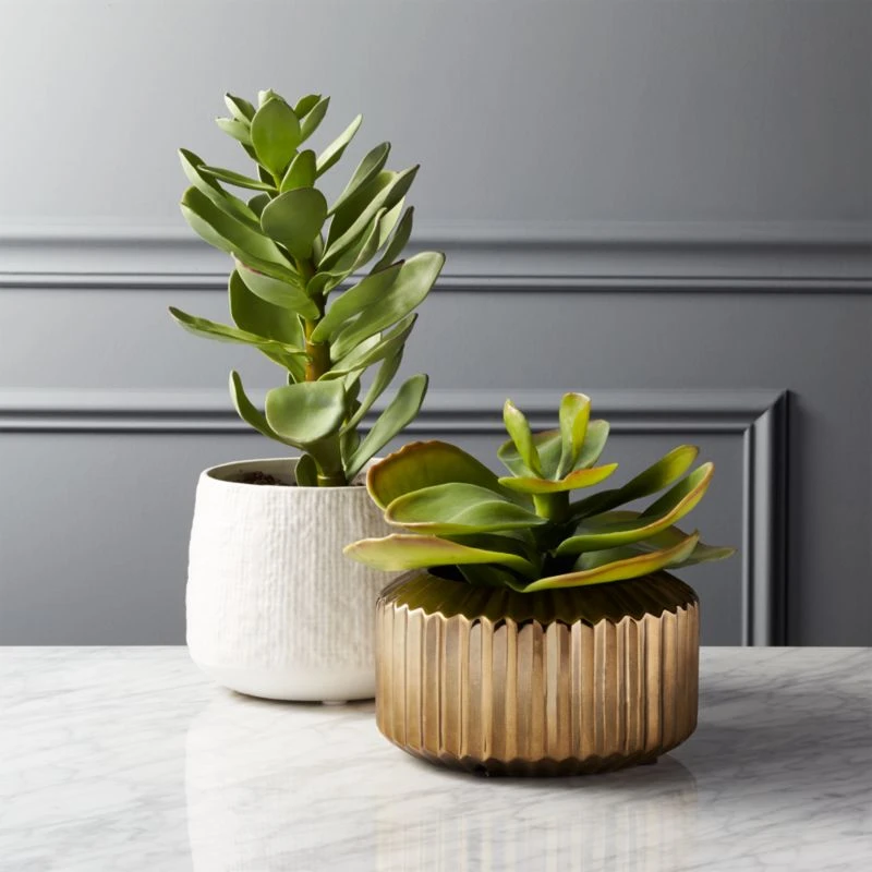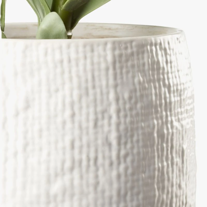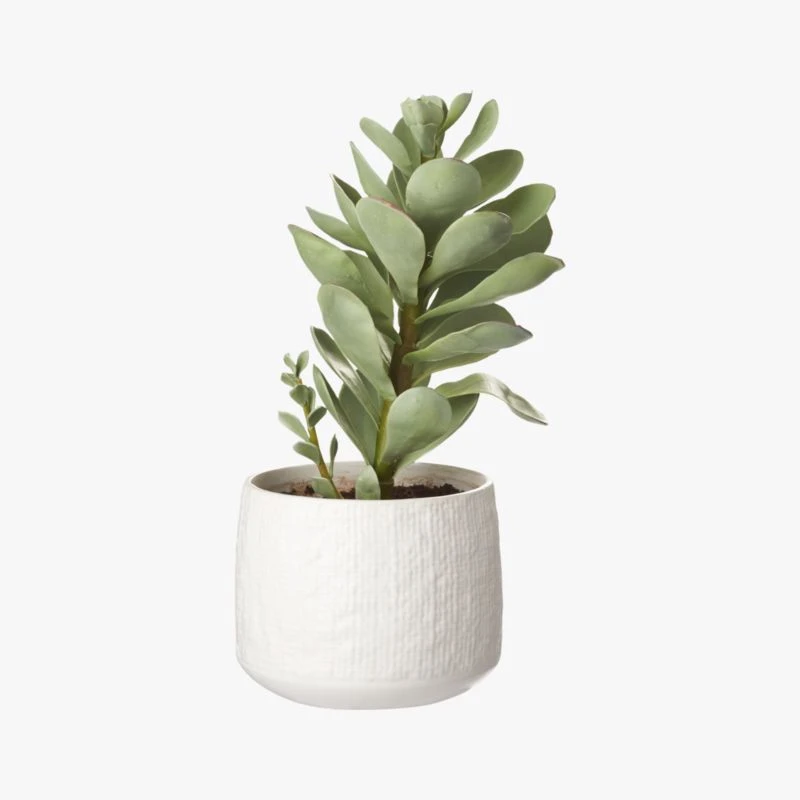 Textured white stoneware vessel pots a forever-green faux succulent. Brings soothing vibe to any environment and requires zero care. CB2 exclusive.