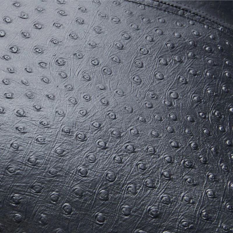 Supple black leather is embossed with an ostrich print and pieced together with matching thread in this wildly stylish pillow. Flips to solid cotton back, reactive dyed to match. Much like real ostrich, no two pillows will sport exactly the same pattern, and leather construction means the color will vary and patina over time as well. CB2 pillows include a pillow insert in your choice of feather-down or down alternative. CB2 exclusive.